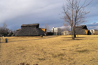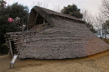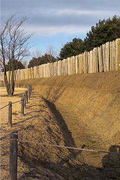 写真は「大塚遺跡」、≒2000年前の環濠集落の姿を再現している遺跡公園で、環濠・土塁・木柵と弥生式竪穴住居7棟・高床式倉庫1棟が復元されている。