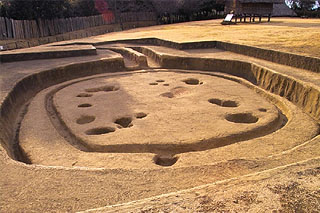 一般的には、ひとが飛び越えられないほどの濠で集落を囲い、濠の外側には土塁を盛り、さらに木の柵が設けられていたという。住居や食物倉庫だけでなく物見櫓(楼観)を築かれていた。また外敵に備えるだけでなく、排水・排湿・害獣対策にも役立った。 |