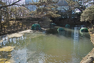 橋脚のいたみがひどいため、根本的な保存対策をとるまで応急処置として、簀巻きにされ乾燥から防いでいる。(笑